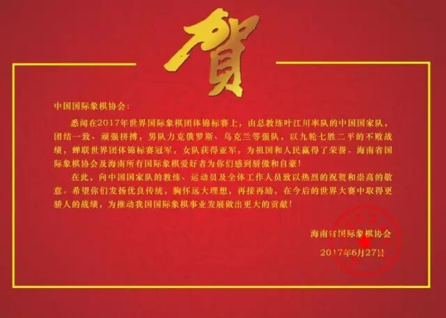 中国国际象棋协会: 悉闻在2017年世界国际象棋团体锦标赛上,由总教练叶江川率队的中国队,团结一致、顽强拼搏,男队力克俄罗斯、乌克兰等强队,以九轮七胜二平的不败战绩,蝉联世界团体锦标赛冠军,女队获得亚军,为祖国和人民赢得了荣誉。海南省国际象棋协会及海南所有国际象棋爱好者为你们感到骄傲和自豪! 在此,向中国国家队的教练、运动员及全体工作人员致以热烈的祝贺和崇高的敬意。希望你们发扬优良传统,胸怀远大理想,再接再厉,在今后的世界大赛中取得更骄人的战绩,为推动我国国际象棋事业发展做出重大的贡献! 海南省国际象棋协会 2017年6月27日 |